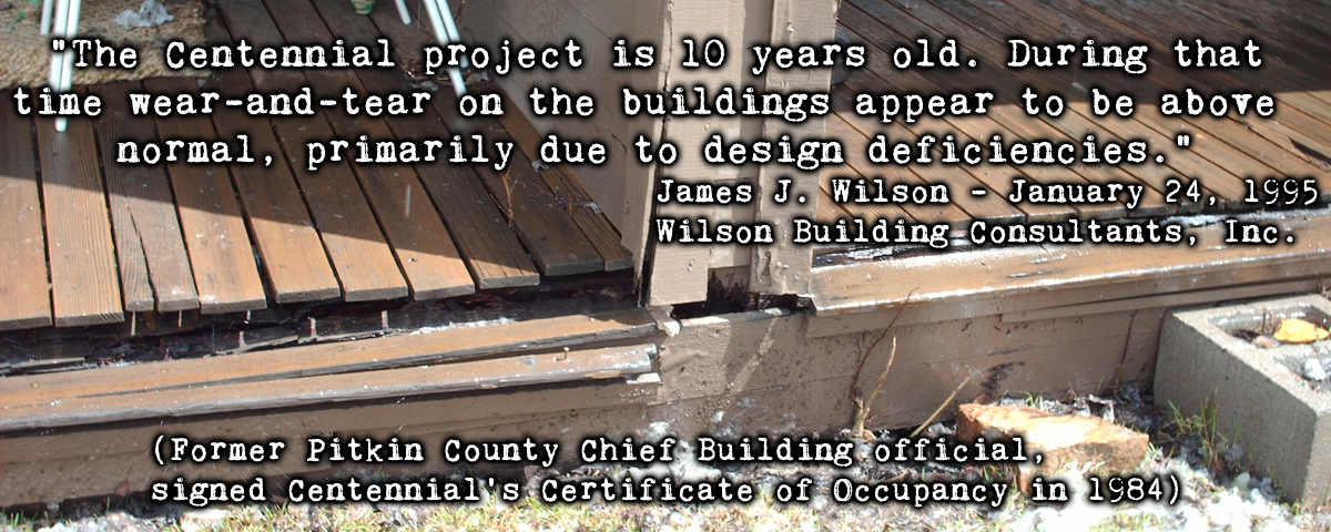 Centennial Condominiums are 92 deed-restricted, affordable, employee housing units located in Aspen, Colorado. There are 148 rental units on the same site separately owned and managed by the original developer. The project was built in less than 6 months in 1984 by a first-time, private developer in cooperation with Pitkin County and without any public subsidy. The project, while well-intentioned, was so poorly executed and supported that its current situation was inevitable. Overwhelming evidence points to pervasive design flaws and construction defects causing severe water-damage so much so that leaks are unrelenting, the structure is extensively rotted and unsound, and mold grows throughout the buildings.